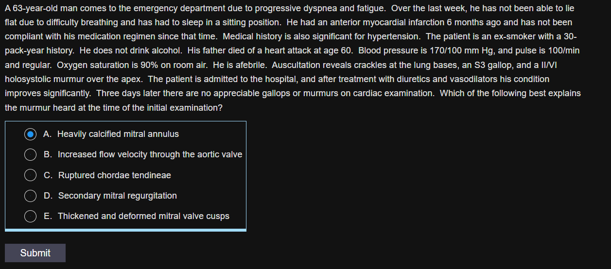 (Choice E) Thickened and deformed mitral valve cusps can occur in rheumatic heart disease and are a potential cause of primary MR. Such a murmur does not resolve with treatment of decompensated heart failure. In addition, mitral stenosis (evidenced by an opening snap and mid-diastolic rumble) is more likely than MR to occur with rheumatic heart disease.