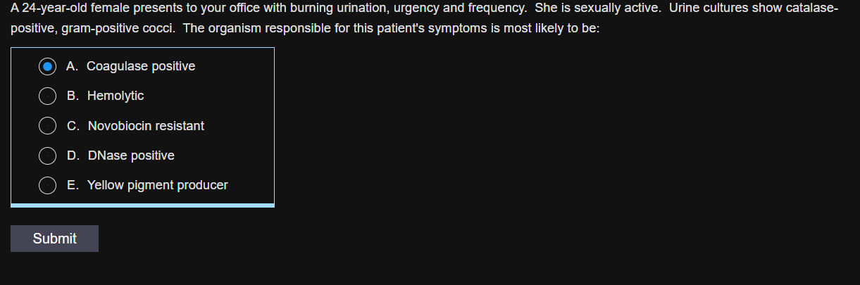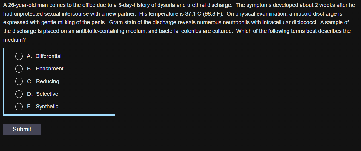 This patient with dysuria and urethral discharge has gonococcal urethritis as indicated by the Gram stain showing gram-negative diplococci within leukocytes. Neisseria gonorrhoeae can be cultured on Thayer-Martin VCN selective medium, which contains vancomycin, colistin, nystatin, and trimethoprim. These antibiotics kill potential contaminants such as gram-positive organisms (vancomycin), gram-negative organisms other than Neisseria (colistin and trimethoprim), and fungi (nystatin).