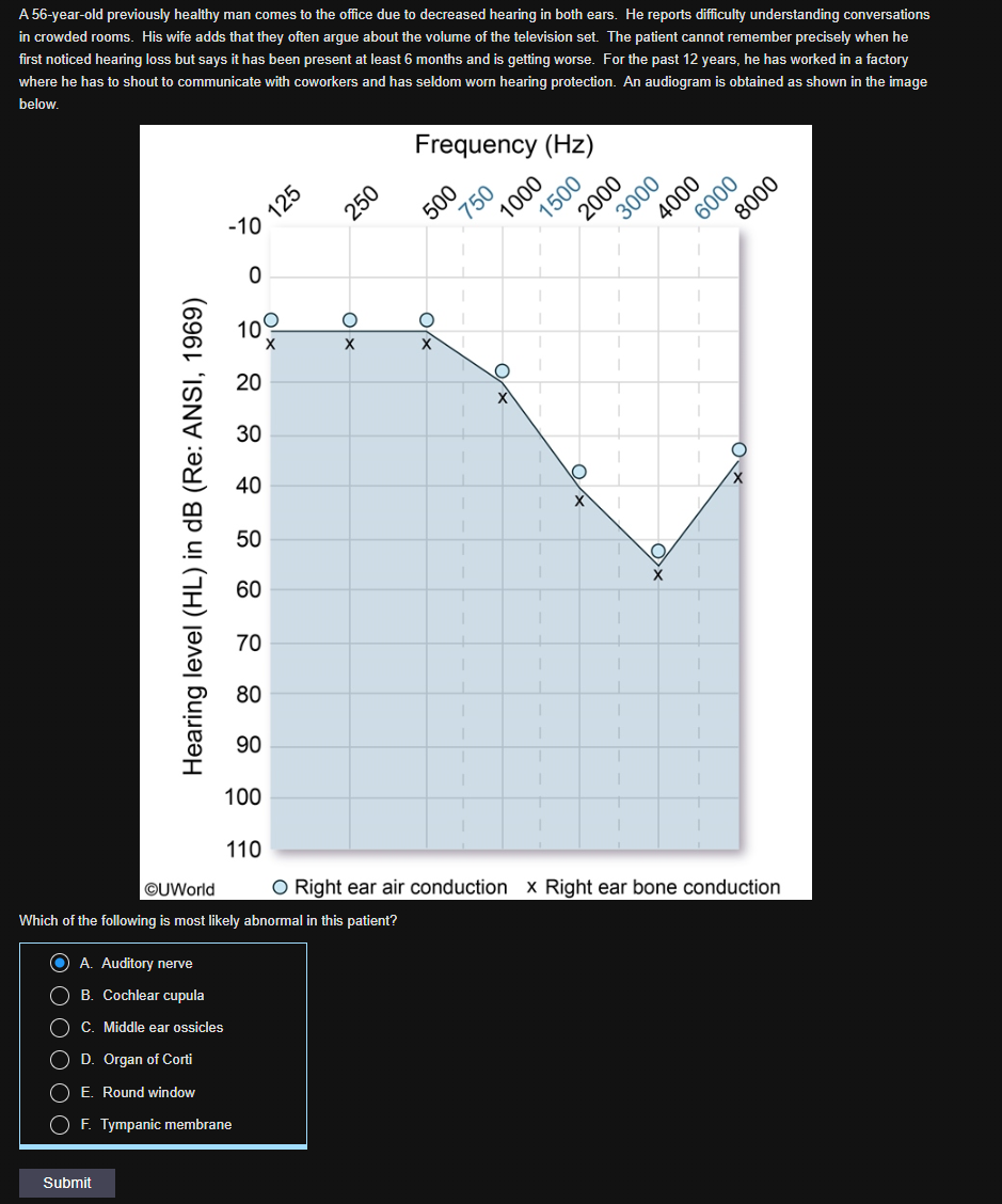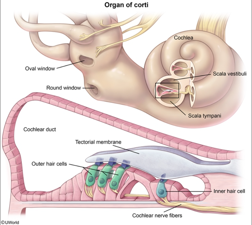 This patient has high-frequency hearing loss due to chronic noise exposure. Transduction of mechanical sound waves into nerve impulses occurs in the organ of Corti through the following steps: