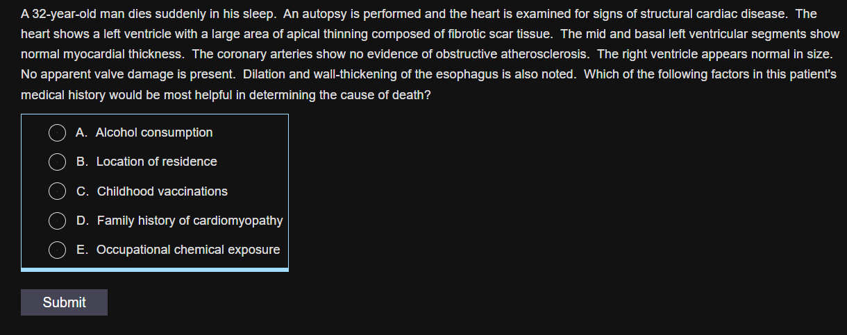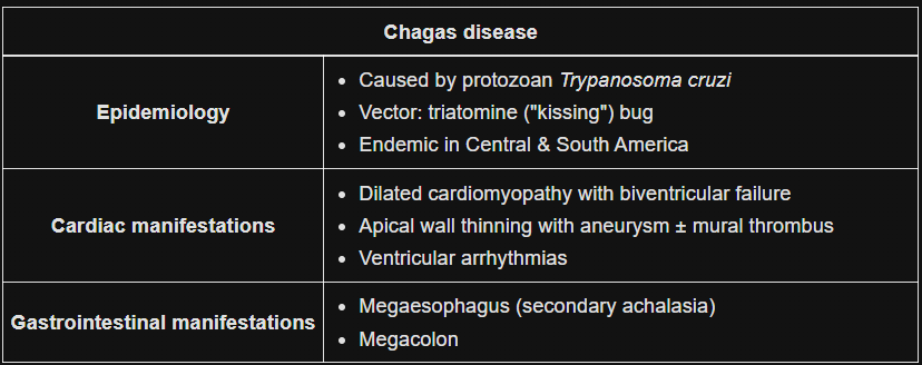 Years following initial infection, some individuals develop serious end-organ damage affecting the cardiac, gastrointestinal, and/or central nervous systems. Cardiac disease results from a chronic parasite-induced and immune-mediated myocarditis that leads to dilated cardiomyopathy (DCM). Chronic Chagas cardiomyopathy is relatively unique among DCMs in that there is characteristically localized apical wall thinning with the development of a large apical aneurysm. In addition to impairing ventricular systolic function, the aneurysm can harbor mural thrombus that may systemically embolize and cause stroke. Damage to the cardiac conduction system can also trigger ventricular arrhythmias (eg, ventricular tachycardia, ventricular fibrillation) that can lead to sudden cardiac death (the likely cause of death in this patient).