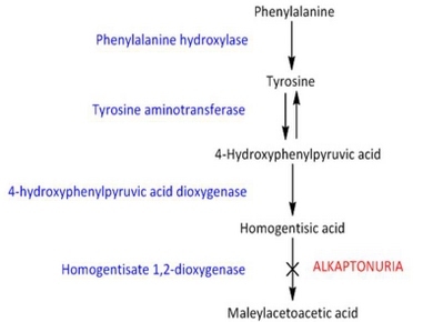 Leads to a build up of homogentisic acid and onchronosis (dark pigment deposistion at mucos membranes)