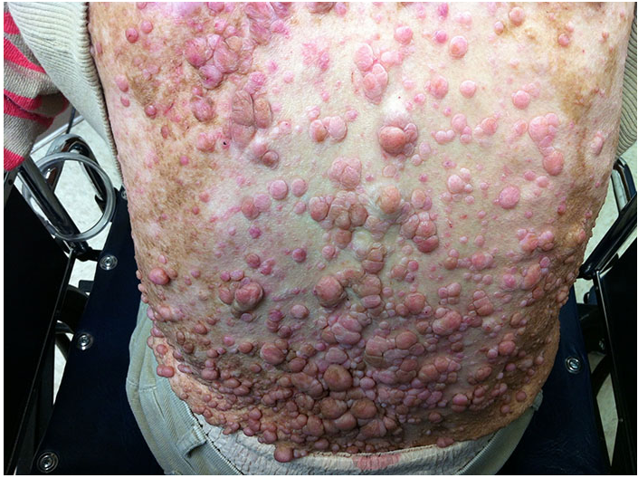 Multiple cafe-au-lait spots and neurofibromas. This patient may also experience arthralgias, vision changes and headaches