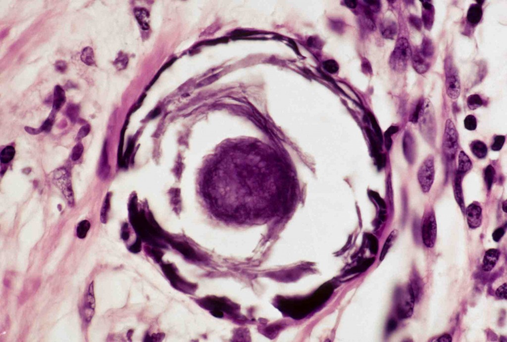 Histologic finding (concentrically laminated, calcified structure) Psammoma bodies are found in papillary adenocarcinoma of the thyroid, papillary cystadenocarcinomas of the ovary, meningiomas, and malignant mesotheliomas PSaMMoma: P - Papillary thyroid carcinoma S - serous cystadenocarcinoma of the ovary M - mesothelioma M - meningioma