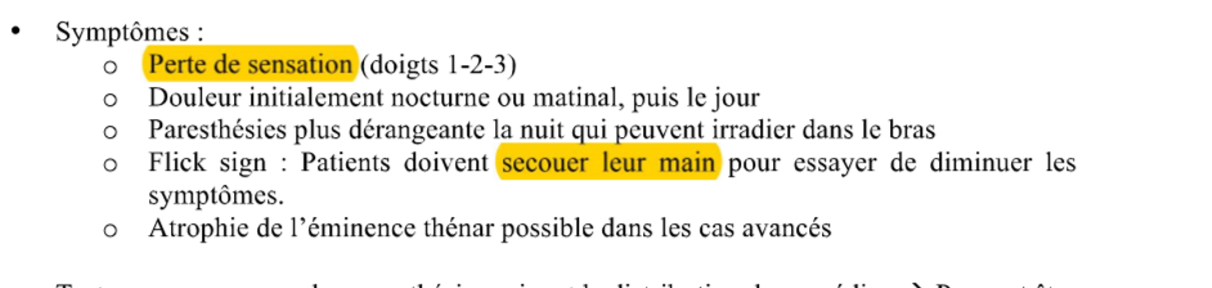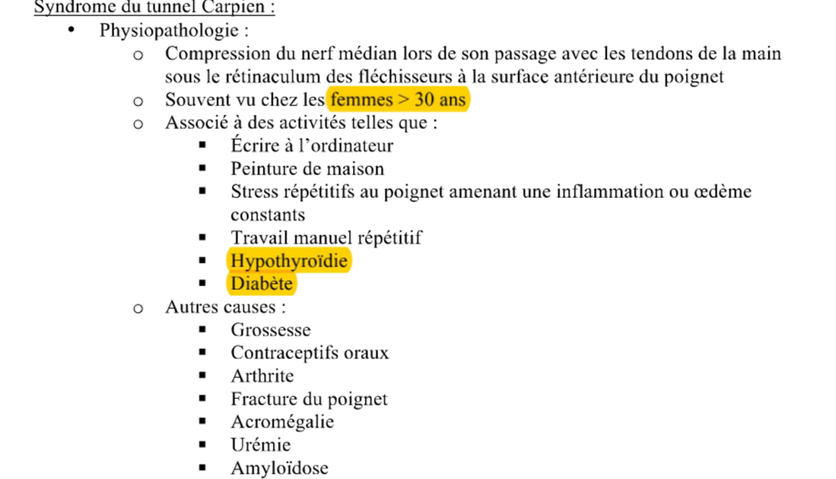donne la présentation clinique ( pas symptome, mais qui pogne ca) u syndrome tunnel carpien