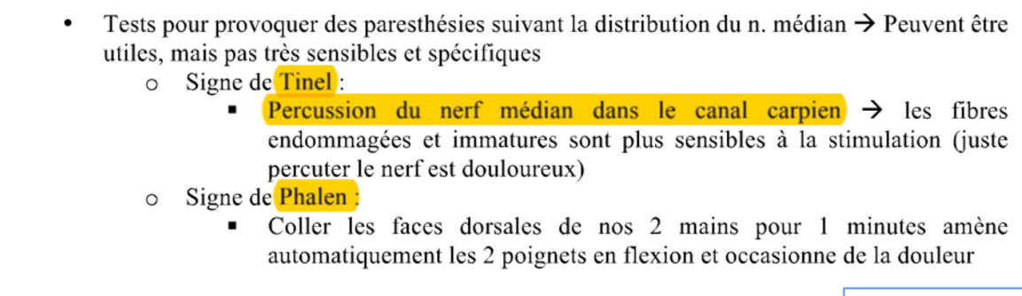 à l’examen physique donne 2 test fait pour diagnostiquer syndrome tunnel carpien