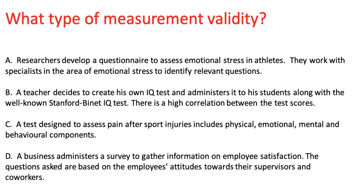 Predictive Validity: test predicts future outcomes. Example: SAT scores are used to predict college GPA. If high SAT scores actually lead to high GPAs, the SAT has good predictive validity.