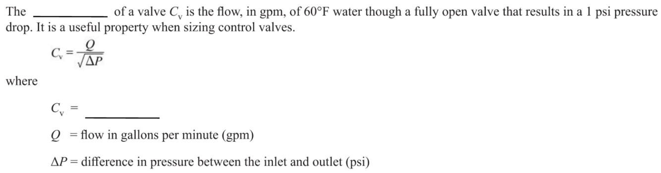 A valve’s _____________ reveals its capacity to allow fluid to flow through it, essentially indicating how much fluid can pass through the valve at a given pressure drop; a higher _____________ means a greater flow rate can be achieved with the same pressure drop, signifying a more efficient valve for fluid flow.