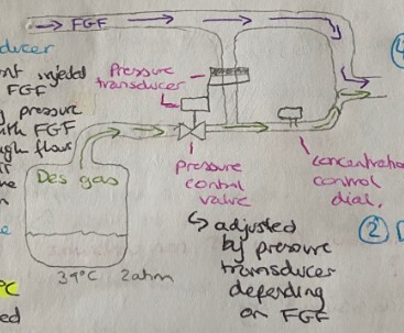 presssure transducer - controls a valve depending on pressure difference in FGF compared to desflurane injectate. hence this accounts for changes to FGF rate. (otherwise high flow rates would dilute it)