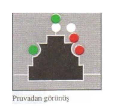A) Borda fenerlerini, bunların gerisinde ve üstünde ufkun her yönünden görülebilir üstte yeşil altında bir beyaz fener, kıç tarafta bir pupa feneri, borda fenerlerinin gerisinde ufkun her yönünden görünür üste beyaz onun altında kırmızı bir fener gösterir.