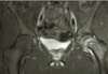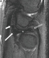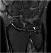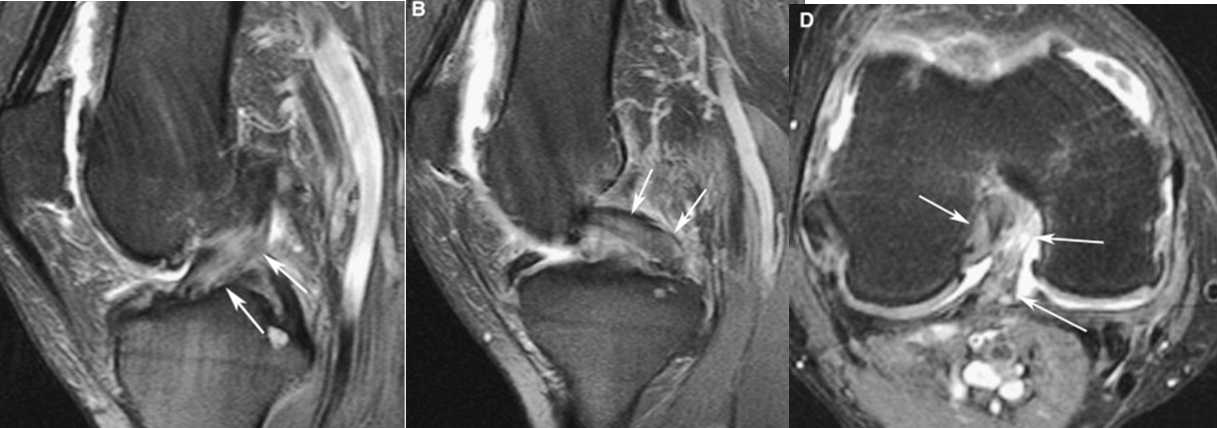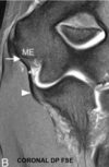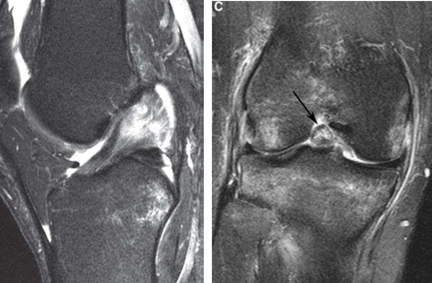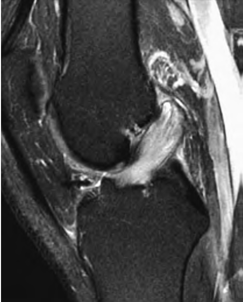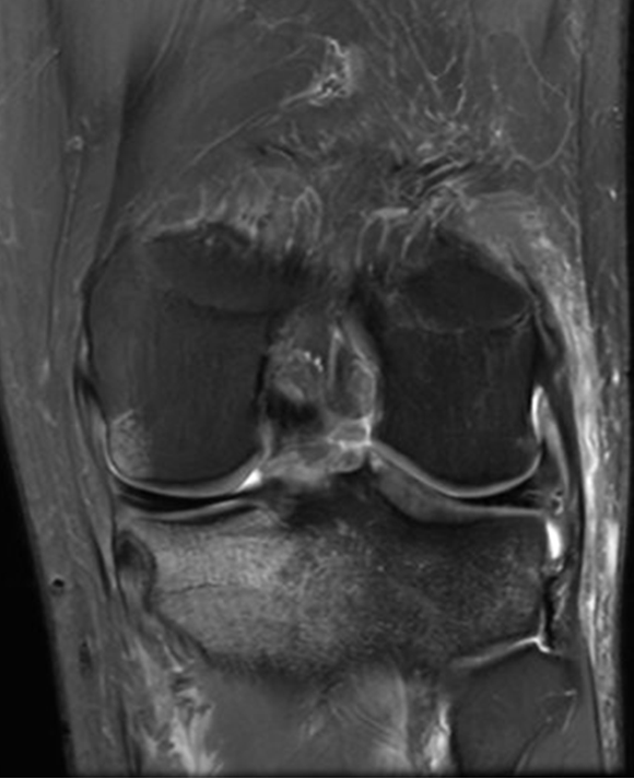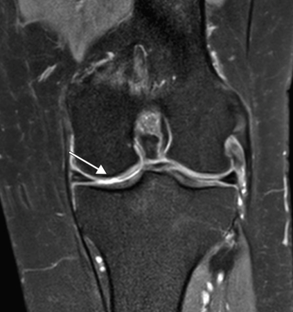 Signo del ligamento colateral coronal. Consiste en la pérdida de la disposición oblicua del ligamento, observándolo completo en el un plano coronal, se observa en casos de inestabilidad estática de la rodilla comúnmente secundario a rotura del LCA.