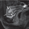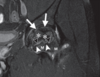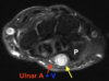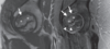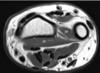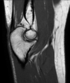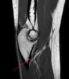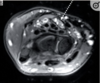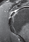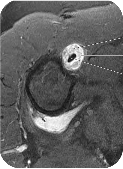 Engrosamiento hiperintenso que rodea el tendón del bíceps en su porción vertical, en relación con Tenosinovitis