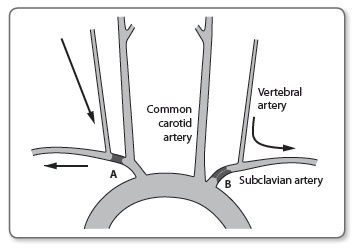 Retrograde flow of blood down vertebral artery to distal subclavian artery if proximal subclavian is stenosed/occluded.