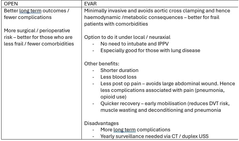 - depending on location of clamp - ischaemia to kidneys, limb, spinal cord / gut