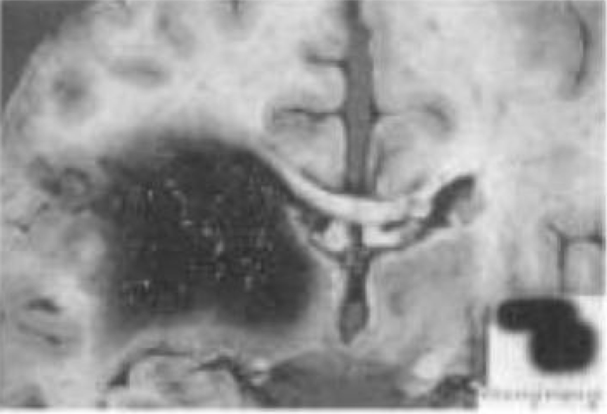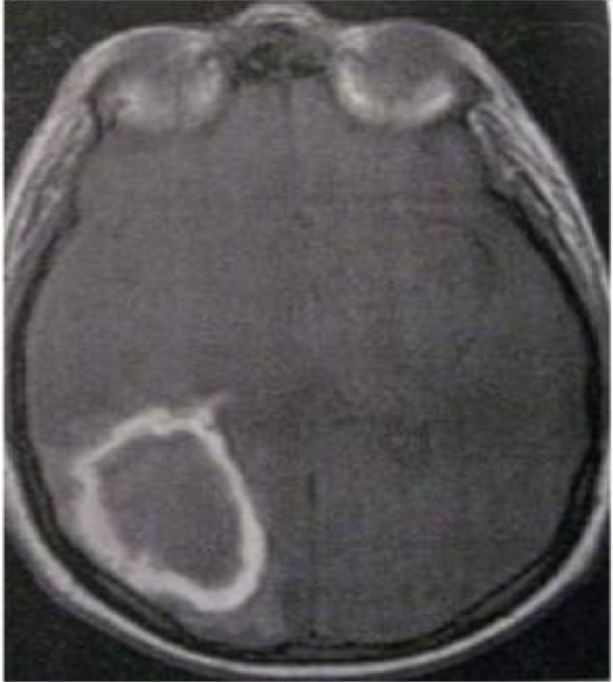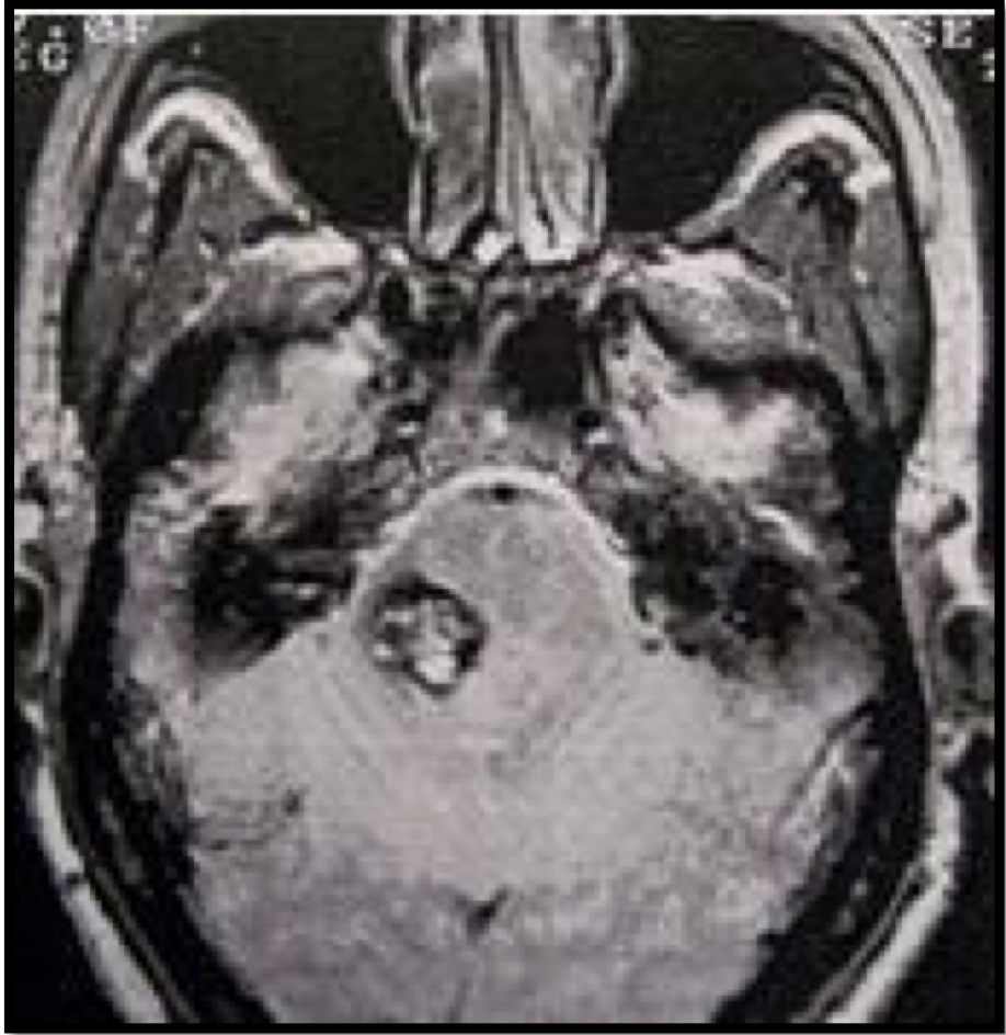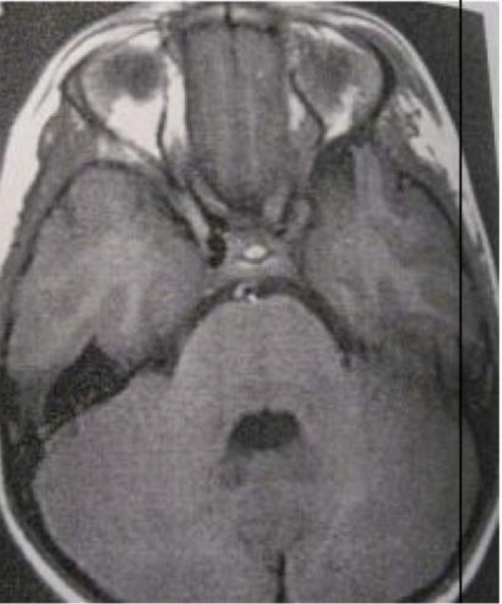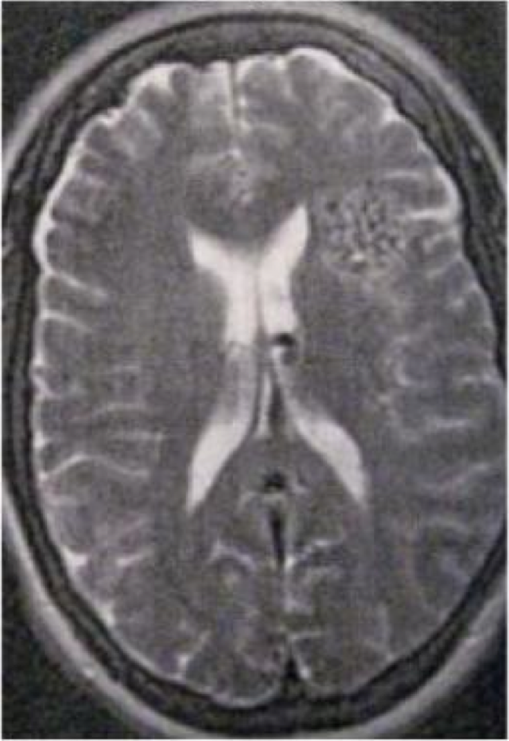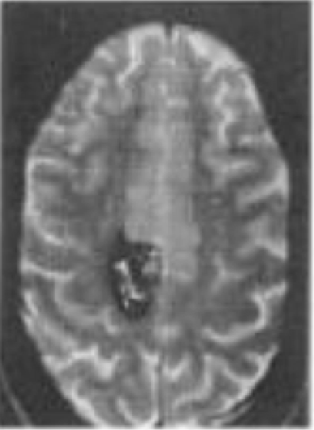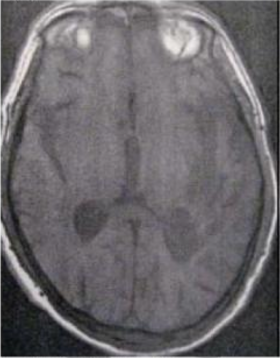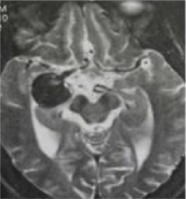 Kelainan apa yang ditunjukkan pada MRI T2-aksial di bawah ini?