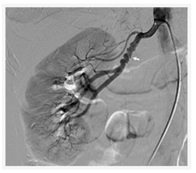 Figure 1: Fibromuscular dysplasia of the right renal artery. The classic “beads on a string” appearance is typical of multifocal fibromuscular dysplasia, the most common type of FMD.