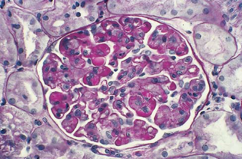 Conspicuous glassy aggregates (“hyaline thrombi”) in the capillary lumina