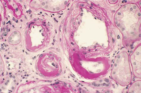 Arterioles exhibiting concentric hyaline thickening of the wall (hyaline arteriolosclerosis)