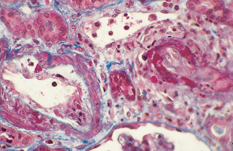 Endothelial damage allows plasma constituents to enter the intima of arteries, walls of arterioles, and subendothelial zone of glomerular capillaries, narrowing lumina and causing ischemia. Endothelial damage also promotes thrombus formation