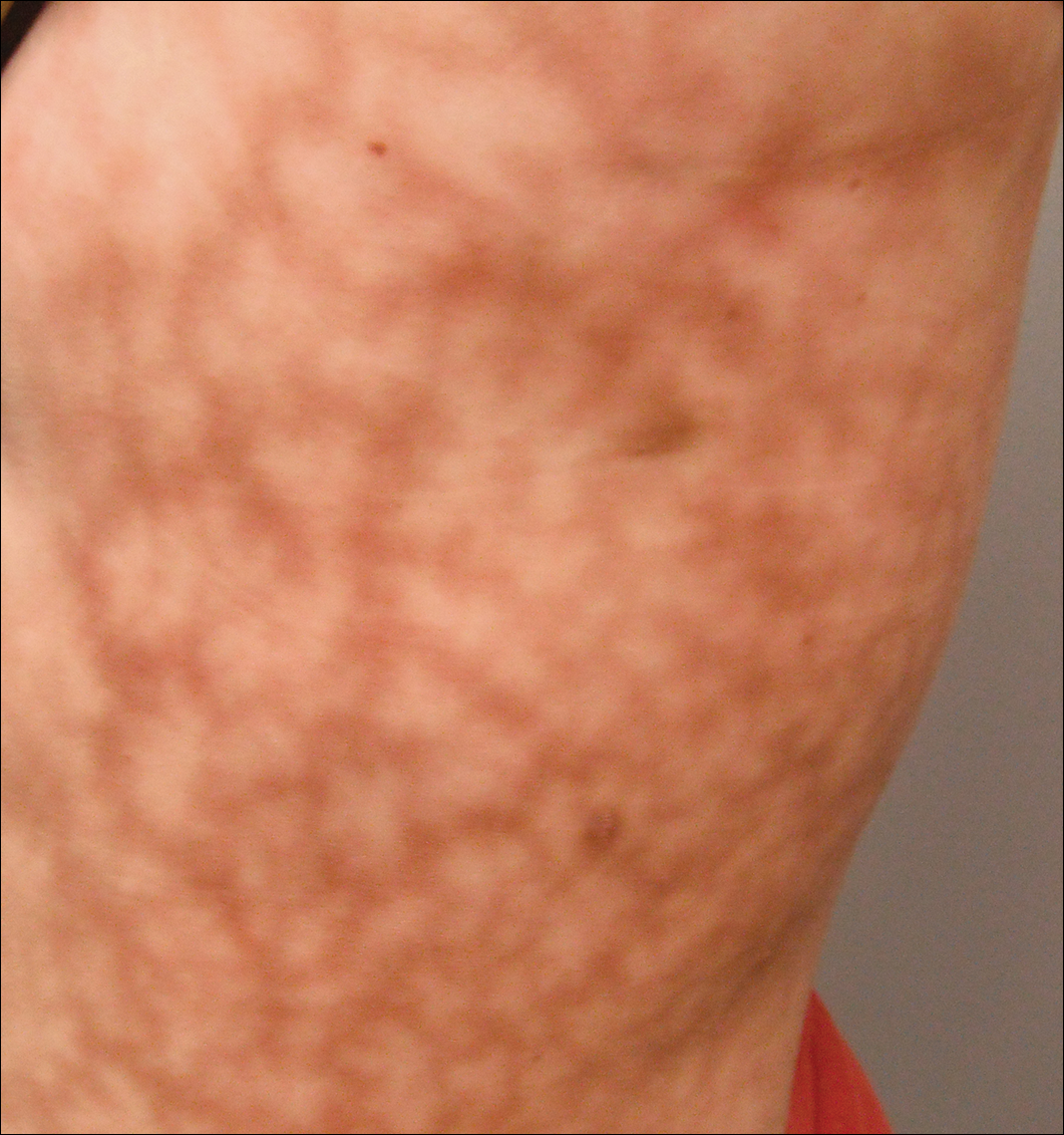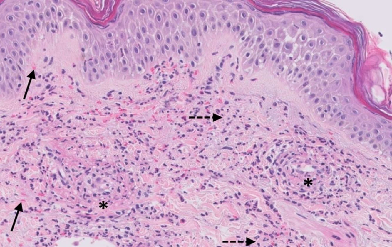 Small vesse vasculitis on H and E. Note the asterix in the vessel wall and extravasated RBCs (the histological equivalent to the finding of non-blanching erythema)