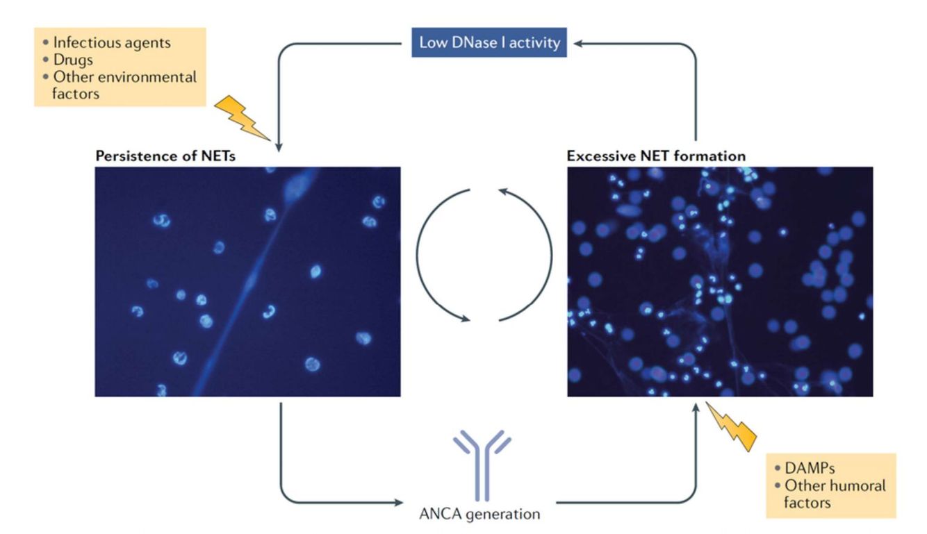 Impaired DNAse I activity leads to NET persistence following physiological NETosis. This leads to some damage which is then associated with anti-PR3 and anti-MPO antibody development. These ANCAs then activate further NETosis via FcγRI binding.