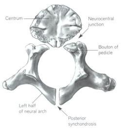 The adult vertebral body is derived from the juvenile centrum and the boutons of the pedicles (the boutons of the pedicles are the anterior part of the neural arches)