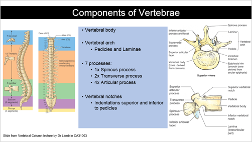 Components of a vertebrae * Vertebral body * Vertebral arch * 7 processes * Vertebral notches What forms the vertebral arches? What are the 7 processes? Where are the vertebral notches?