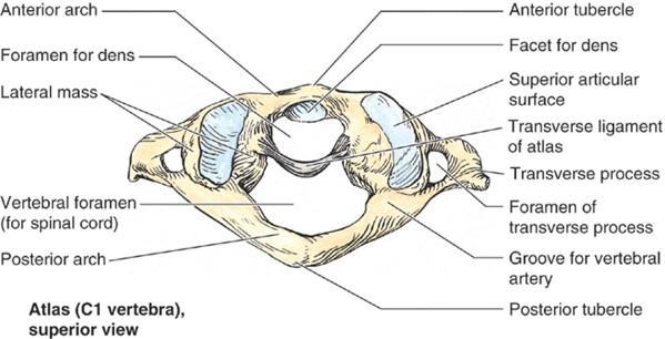 The C1 vertebrae has no spinous or transverse processes Instead it has an anterior and posterior vertebral arch, each with a tubercle Superiroly, the C1 vertebrae articular surfaces articulate with the occipital condyles
