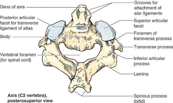 C2 is also known as the axis The dens is upward projection from the body of the axis The transverse ligament of the atlas holds the dens in place allowing the atlas to rotate on the superior articular facets of the axis - axial rotation of the neck