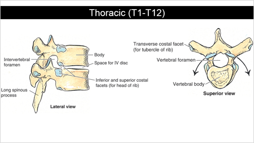 The thoracic vertebra posses costal facets for the articulations of the rib (superior and inferior costal facets as well as transverse costal facets) The superior and inferior articular facets are nearly vertical facing posteriorly and anteriorly respectively The spinous processes are long and slopig