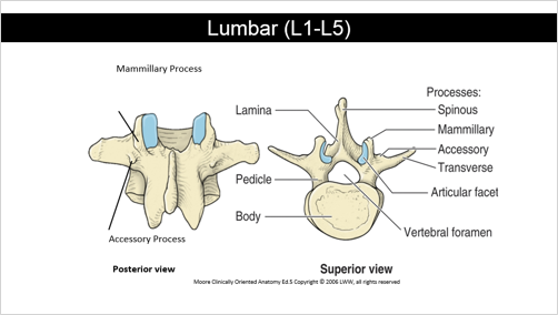 The lumbar vertebral bodies are kidney shaped There are accessory processes on transverse processes and mamillary processes on superior articular facets The accessory & mamillary processes serve as a site of muscle attachment Superior articular facets face posteromedially Inferior articular facets face anterolaterally