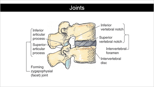 IV discs - secondary cartilaginous joint Facet joint (zygapophyseal joint) - synovial plane joint