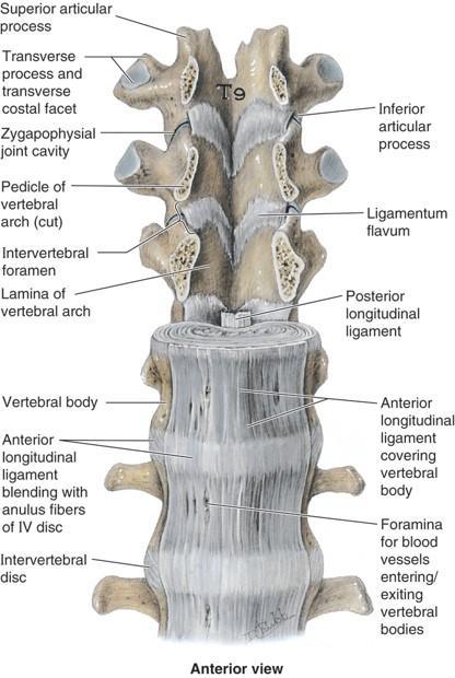 Ligaments of the vertebral column * Anterior longitudinal ligament * Posterior longitudinal ligament * Ligamentum flavum * Nuchal ligament * Supraspinous ligament * Interspinous ligament * Intertransverse ligament Discuss the anterior and posterior longitudinal ligaments