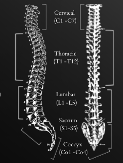 cervical = 7 thoracic = 12 lumbar = 5 sacrum = 1 (5 fused) coccyx = 1 (4 fused)