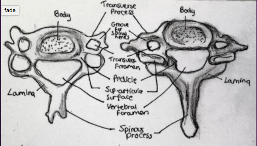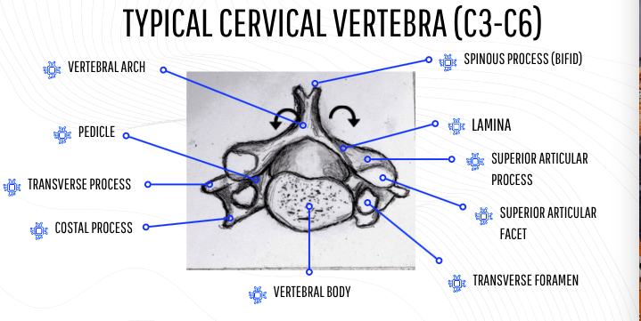 transverse processes = contain foramina transversarium, shaped like an L to permit lateral slanting of vertebral artery (remember C1 has lateral transverse foramen)