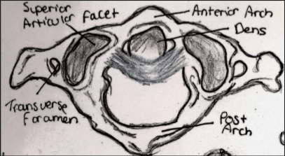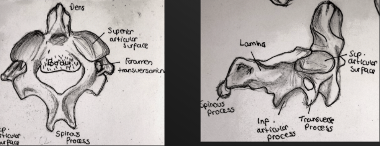Dens = piece of bone that extends upwards from vertebral body + articulates with posterior surface of C1 anterior arch