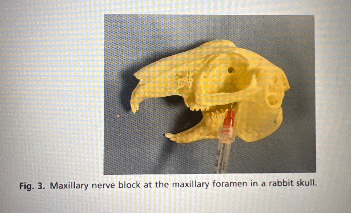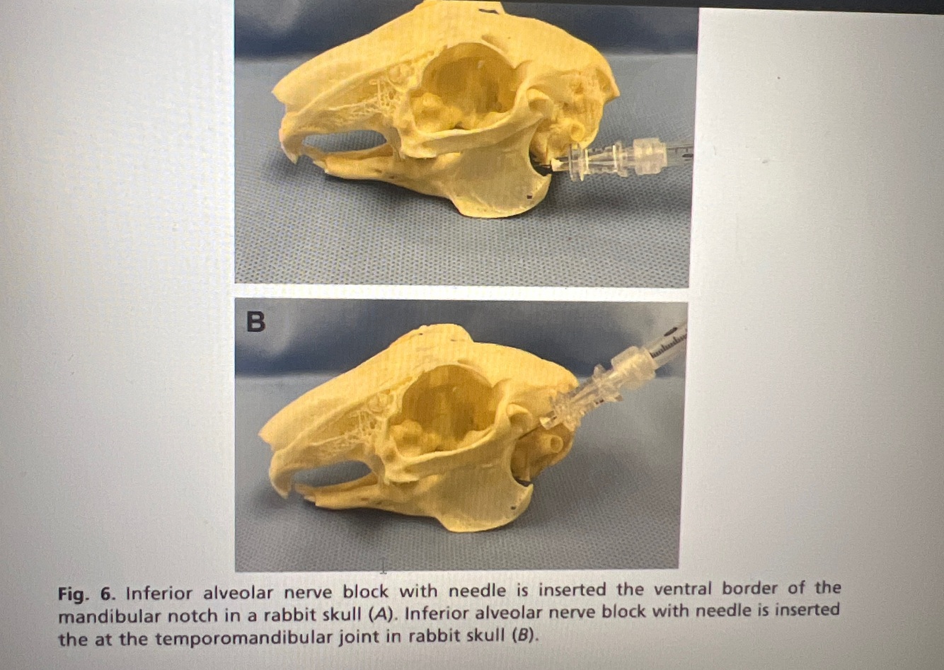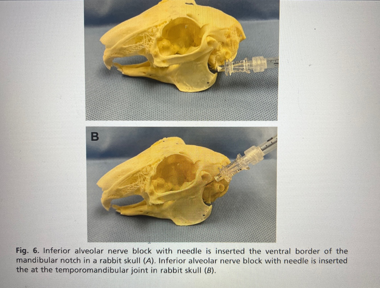 Insert needle below the zygomatic arch and caudal to lateral canthus of eye, and slowly advance dorsally, medially, and caudally until bone is contacted, then withdraw slightly and inject after negative aspiration.