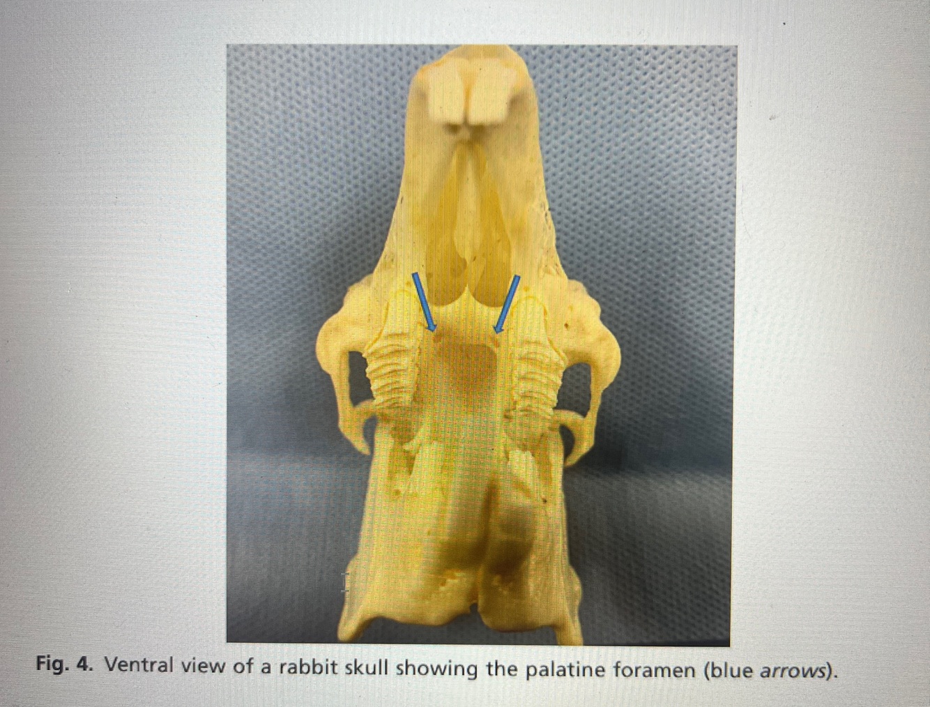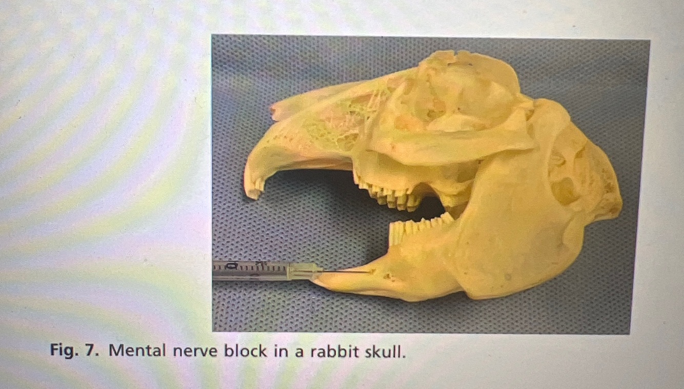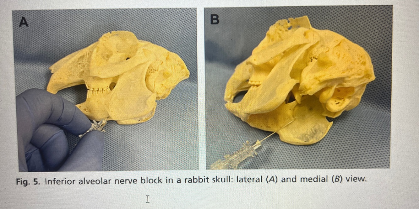 Insert needle below the zygomatic arch and caudal to lateral canthus of eye, and slowly advance dorsally, medially, and caudally until bone is contacted, then withdraw slightly and inject after negative aspiration.