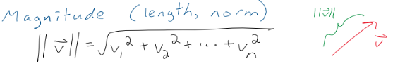 The magnitude of a vector is its length or size, denoted by ||v||.