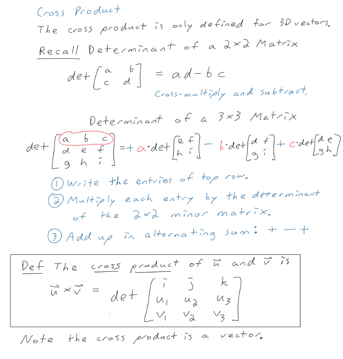 The components of the cross product can be calculated using the determinant of a matrix formed by the unit vectors i, j, k and the components of the two vectors.