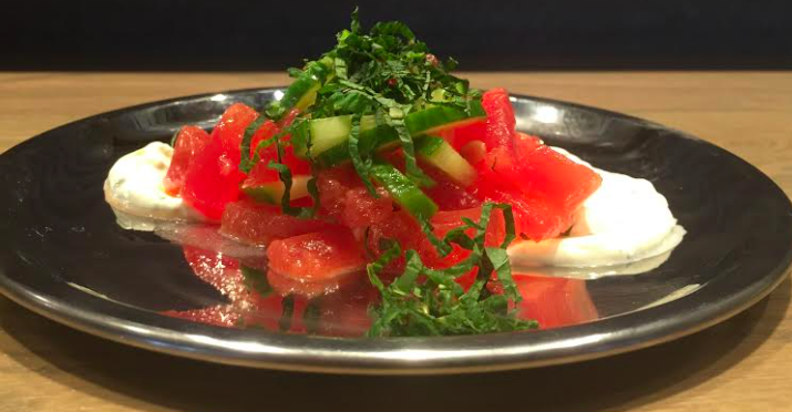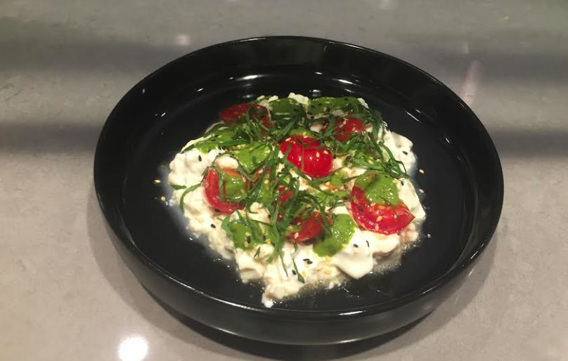 (House take on caprese). Tomatoes marinated in salt and sugar mixed with silken tofu and burrata. Topped w. thai basil, cilantro, parmesan, and sesame paste pesto then drizzled w. black vinegar. Garnished with toasted sesame seeds.