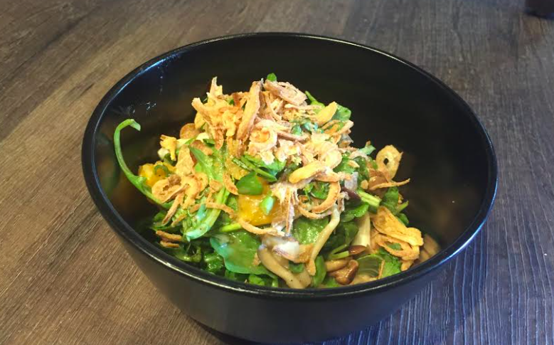Wild and cultivated mushrooms pickled in rice vinegar, tossed with watercress, orange slices, and tamarind vinaigrette (tamarind paste, soy sauce, shallot oil, rice vinegar). Garnished with fried shallots.