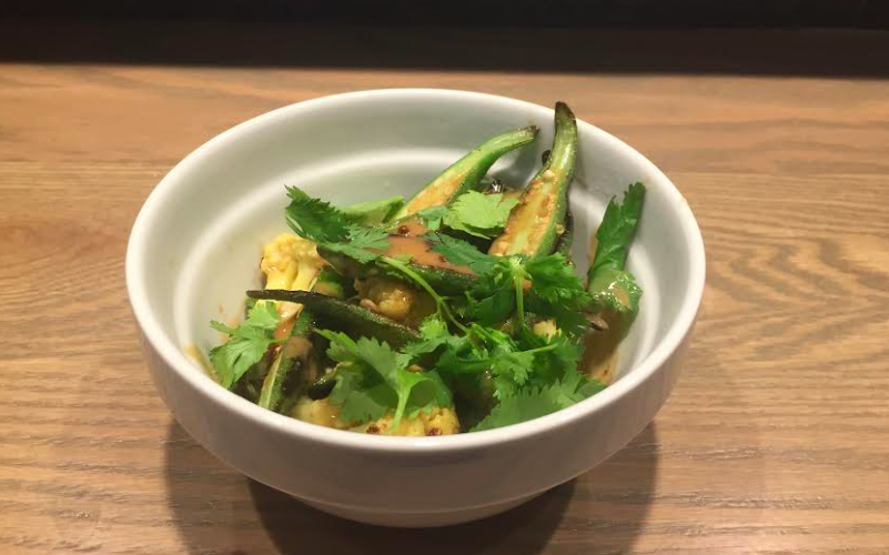 Charred okra, brown butter, curry pickled cauliflower, mustard seed