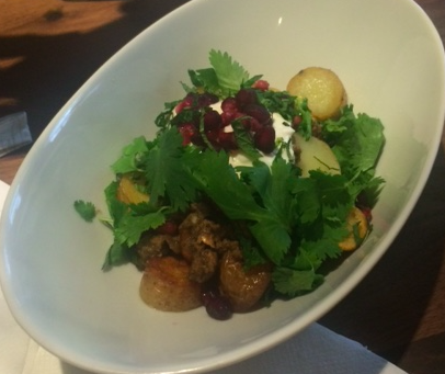 Fingerling potatoes, blanched then roasted in lamb fat. Tossed w. meat sauce is made from ground lamb, onions, garlic, ginger and garam masala (Indian spice blend). Topped w. yogurt seasoned with lemon and lime. Garnished with pomegranate seeds, mint and cilantro.