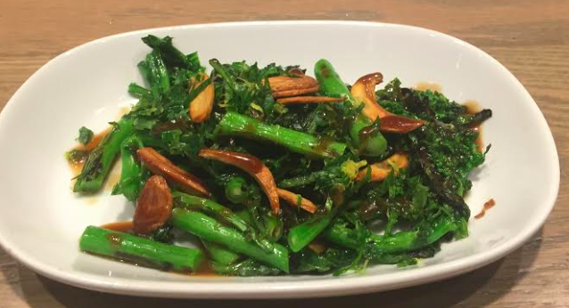 (House version Chinese broccoli with oyster sauce). Broccoli rabe is grilled until lightly charred. Oyster sauce is smoked and cooked w. scallions, ginger and raw garlic. Garnished with gremolata (lemon zest, garlic, parsley and cilantro). Finished with crispy fried garlic and lemon juice.