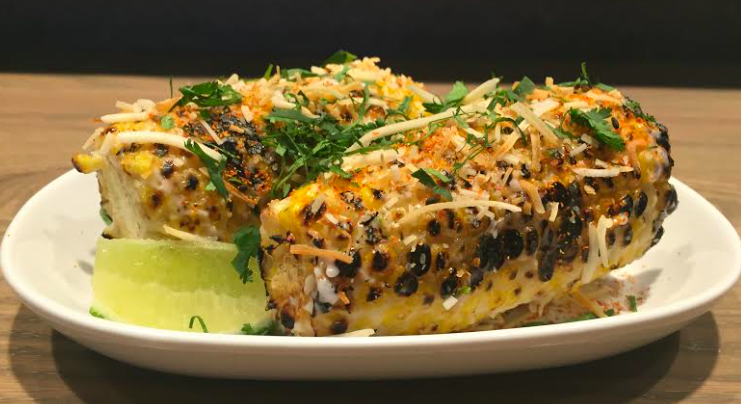 Grilled corn on the cob, whipped coconut cream, toasted coconut, lime salt