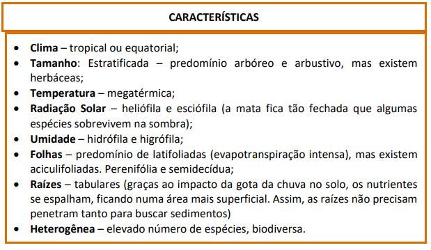 Também são conhecidas como floresta pluvial, úmida ou ombrófila. São encontradas na zona intertropical (tórrida – entre o Trópico de Câncer e Capricórnio). A vegetação se adapta ao elevado índice térmico e pluviométrico.