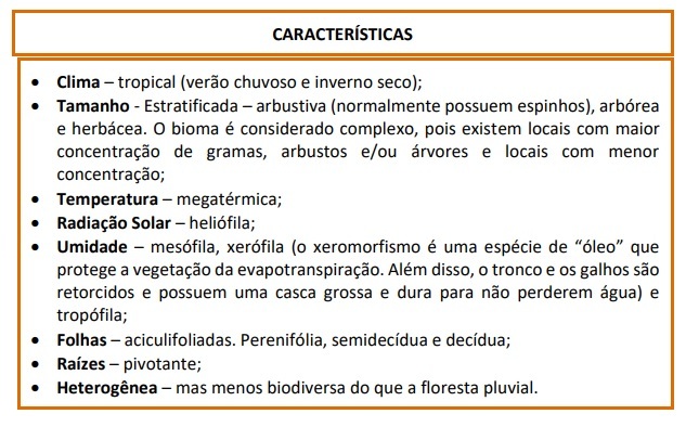 O Cerrado e a Caatinga são considerados Savana. Esse bioma também está localizado na zona tórrida, precisamente na África, Índia, Indochina, América do Sul, México e Austrália, adaptando-se a uma estação seca e uma chuvosa. Assim, as árvores são bem espaçadas uma das outras.