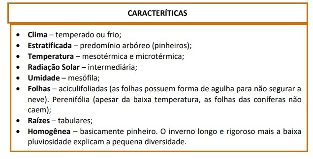 A Floresta Boreal (Coníferas, Aciculifoliada ou Taiga) é encontrada em latitudes médias (entre o Trópico de Câncer e o Círculo Polar Ártico), especificamente na América do Norte, Norte da Europa e algumas regiões montanhosas.