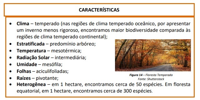 A Floresta Temperada (Decídua ou Caducifólia) é encontrada em latitudes médias, na América do Norte, Europa, Ásia e Oceania. Esse bioma é típico de regiões altamente industrializadas e urbanizadas. Portanto, foi muito desmatado.