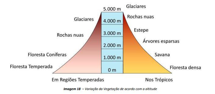 A vegetação varia conforme a altitude. Em áreas de baixa altitude, predominam as matas tropicais. Conforme a altitude vai aumentando aparecem as savanas, depois as florestas temperadas, as estepes e, finalmente, as regiões cobertas pelas neves eternas.